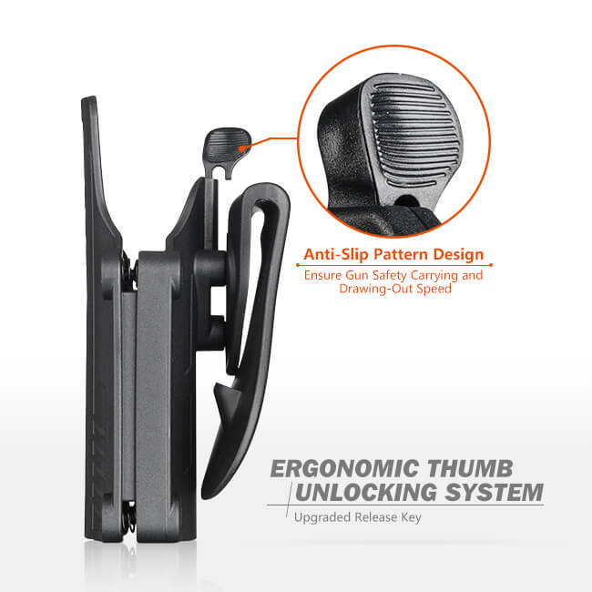 T-ThumbSmart Holster uses a THUMB release mechanism to make a brand new upgrade in concealment. The thumb unlock button is concealed between the user’s body and the holster body.